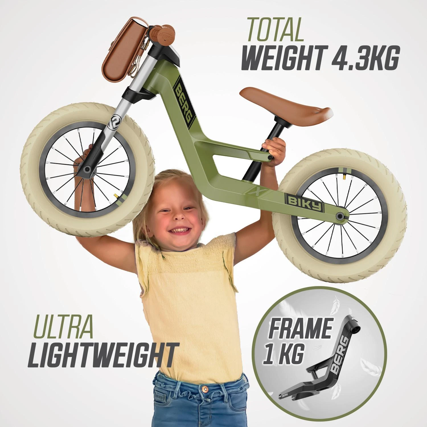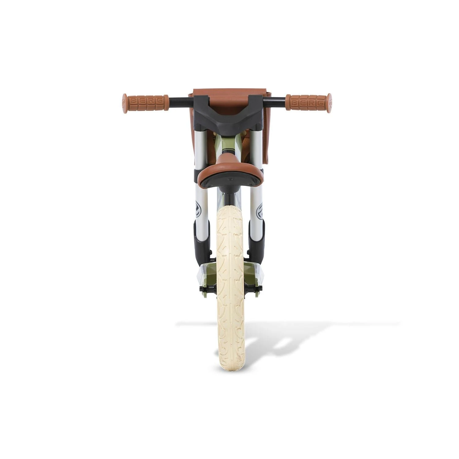 The BERG Biky Retro is stunning with it’s alloy front forks & white retro tyres. And just look at it’s trendy detachable leather look back pack! It’s the ultimate in safety & comfort. It has no protruding parts, a steering angle limiter, adjustable seat and comfortable pneumatic [air filled] tyres. Learning to ride a bike is quite the challenge at a young age, so give your child the safest opportunity to practice balance & co-ordination. They will build confidence and be able to lift those little feet in no time!