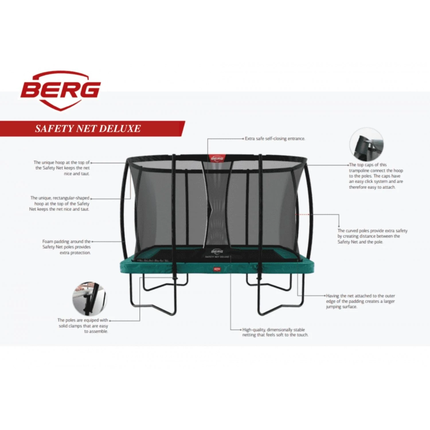 - BERG Safety Net Deluxe is 20% higher, a self-closing entrance with distinctive trim and thick foam around the poles ensure maximum safety.