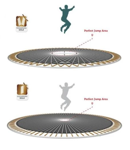 Muelles TwinSpring. Los muelles TwinSpring son muy fuertes y soportan mucho peso. Están galvanizados con zinc para soportar las inclemencias meteorológicas y además están distribuidos de forma oblicua en la cama elástica. Eso significa que la zona de saltar es más grande en comparación con las camas elásticas con muelles en paralelo (como las BERG Favorit) y lo más importante: cada punto de tensión de la lona de salto tiene dos muelles que tiran de ella, para un rebote mucho mejor.