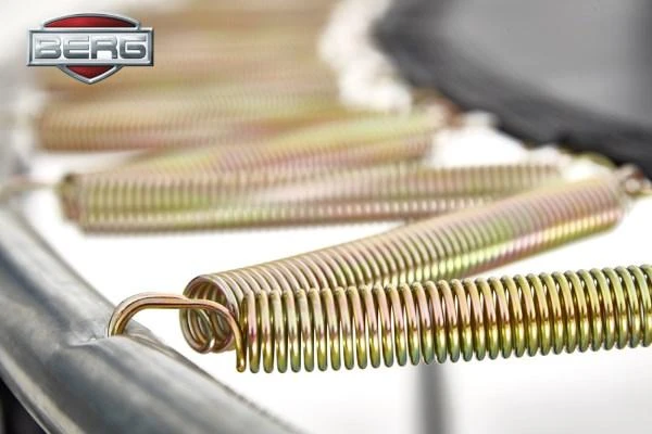 Muelles TwinSpring. Los muelles TwinSpring son muy fuertes y soportan mucho peso. Están galvanizados con zinc para soportar las inclemencias meteorológicas y además están distribuidos de forma oblicua en la cama elástica. Eso significa que la zona de saltar es más grande en comparación con las camas elásticas con muelles en paralelo (como las BERG Favorit) y lo más importante: cada punto de tensión de la lona de salto tiene dos muelles que tiran de ella, para un rebote mucho mejor.