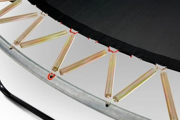 Muelles TwinSpring. Los muelles TwinSpring son muy fuertes y soportan mucho peso. Están galvanizados con zinc para soportar las inclemencias meteorológicas y además están distribuidos de forma oblicua en la cama elástica. Eso significa que la zona de saltar es más grande en comparación con las camas elásticas con muelles en paralelo (como las BERG Favorit) y lo más importante: cada punto de tensión de la lona de salto tiene dos muelles que tiran de ella, para un rebote mucho mejor.