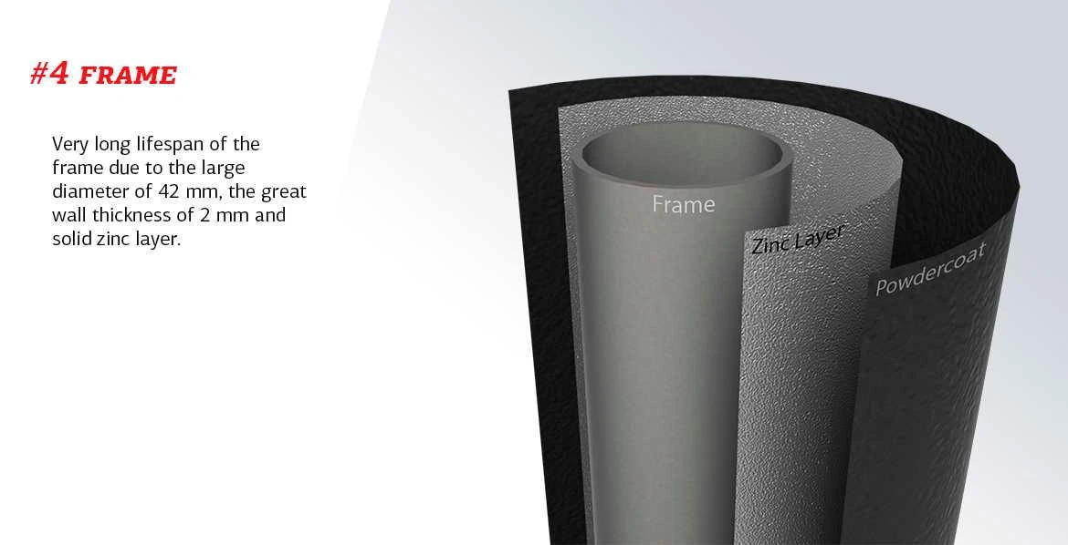Tubo de acero galvanizado y pintado. Para una mayor resistencia a las inclemencias meteorológicas, las camas elásticas BERG Champion, BERG Elite y BERG Pro Bouncer están fabricadas con tubo de acero galvanizado para el exterior y un acabado lacado negro muy sobrio y distinguido.