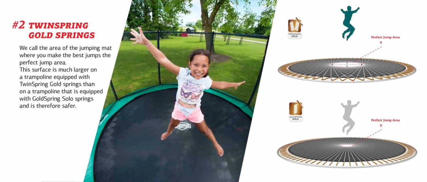 Muelles TwinSpring. Los muelles TwinSpring son muy fuertes y soportan mucho peso. Están galvanizados con zinc para soportar las inclemencias meteorológicas y además están distribuidos de forma oblicua en la cama elástica. Eso significa que la zona de saltar es más grande en comparación con las camas elásticas con muelles en paralelo (como las BERG Favorit) y lo más importante: cada punto de tensión de la lona de salto tiene dos muelles que tiran de ella, para un rebote mucho mejor.