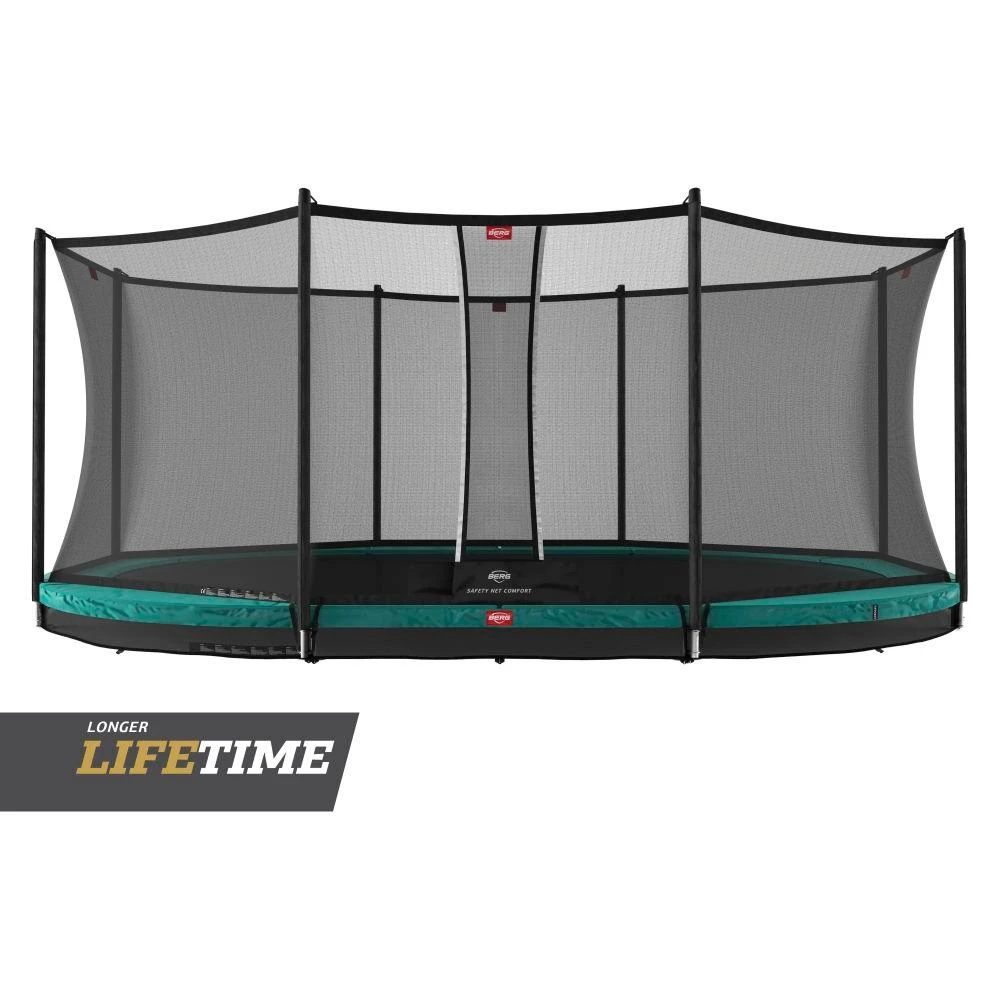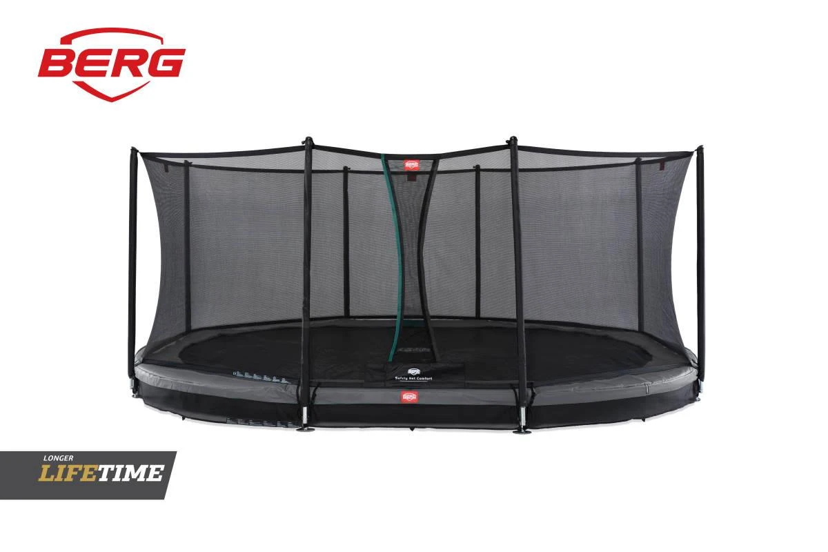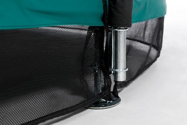 Inground con red de seguridad Comfort. Este modelo de cama elástica para enterrar Inground requiere hacer un agujero en tu jardín y la estructura quedará por encima de la superficie, ocupando unos 20 cm. A esta estructura se acopla la red Comfort para unos saltos aún más seguros.