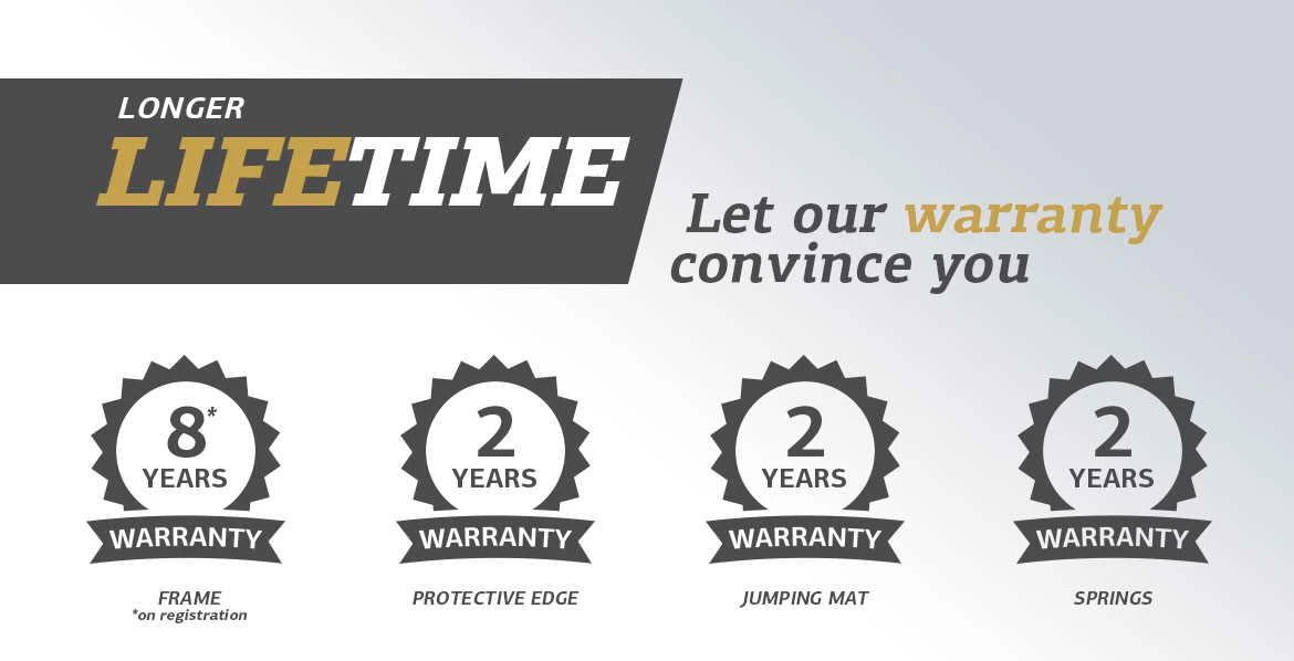 Garantía. Las camas elásticas BERG tienen distintos periodos de garantía en función del tipo de cama elástica y en función del componente. Las camas elásticas Favorit tienen hasta 8 años de garantía en la estructura de acero (5 sin registro) y 2 años de garantía en la lona de salto, el protector de muelles y los muelles.¿Tiene preguntas sobre cómo enterrar una cama elástica? Visite el artículo cómo enterrar una cama elástica en nuestro blog para saber más sobre el como debe hacerlo.