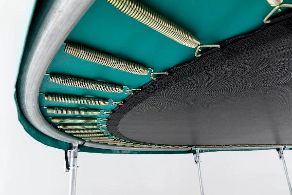 Muelles SoloSpring. Los muelles SoloSpring son muy resistentes al exterior ya que están galvanizados en zinc. Los muelles SoloSpring se sitúan en paralelo entre ellos, de modo que cada punto de tensión de la lona de salto tiene un muelle que tira de él.
