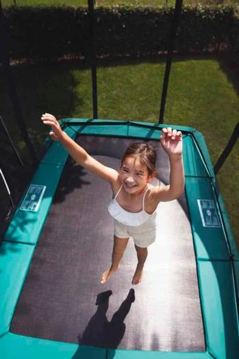 Lona de salto Airflow. La lona de salto Airflow se fabrica con un sistema innovador en el que el entramado de fibras de la lona de salto deja más espacio entre las fibras. Estos huecos más grandes provocan que el aire circule más rápidamente de abajo hacia arriba y no quede embolsado bajo la zona de salto, dando una elasticidad y rebote notablemente superior.