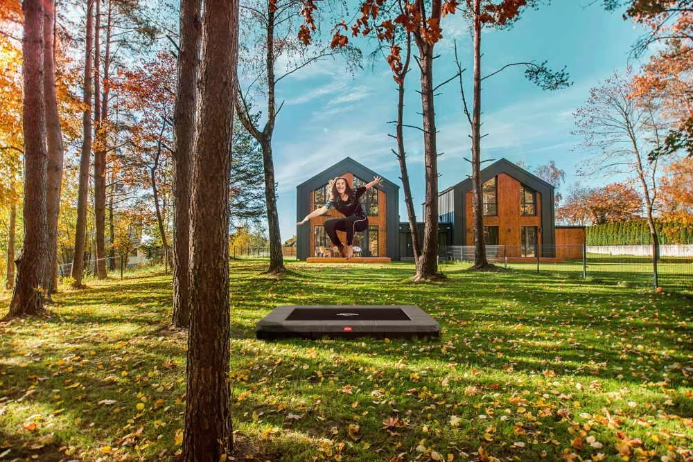 Inground con red de seguridad Comfort. Este modelo de cama elástica para enterrar Inground requiere hacer un agujero en tu jardín y la estructura quedará por encima de la superficie, ocupando unos 20 cm. A esta estructura se acopla la red Comfort para unos saltos aún más seguros.
