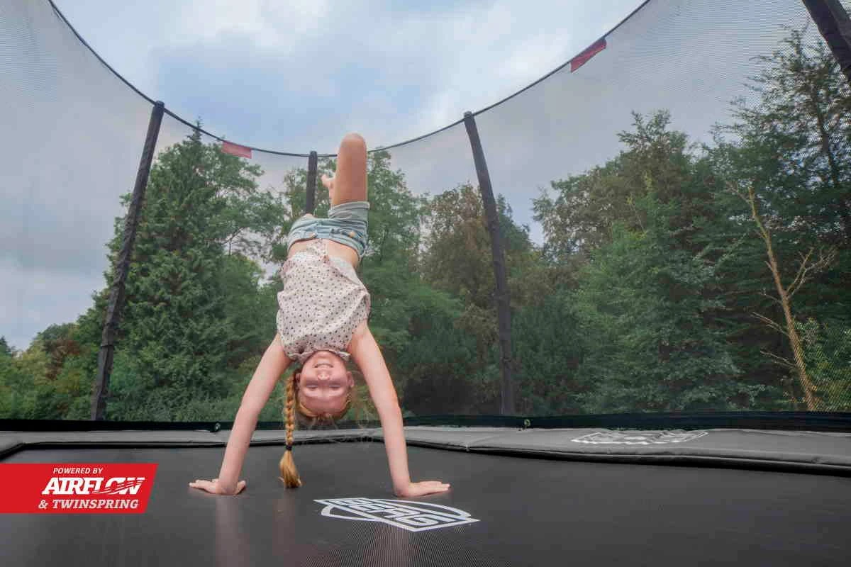 Lona de salto Airflow PRO. La lona de salto Airflow se fabrica con un sistema innovador en el que el entramado de fibras de la lona de salto deja más espacio entre las fibras. Estos huecos más grandes provocan que el aire circule más rápidamente de abajo hacia arriba y no quede embolsado bajo la zona de salto, dando una elasticidad y rebote notablemente superior.