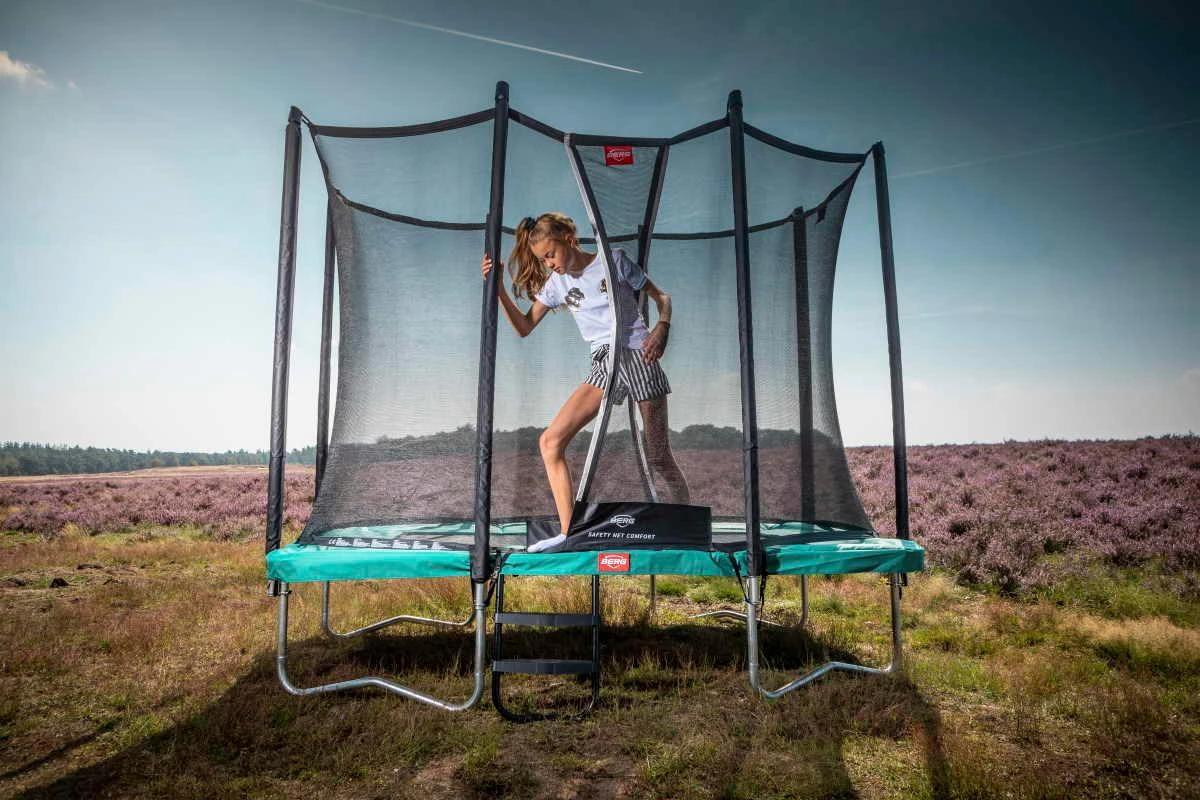 Red de seguridad Comfort. La red Comfort es una red de seguridad de alta calidad que ofrece entrada con solapa (más segura que la cremallera), símbolos para localizar fácilmente la salida de la cama elástica desde dentro y que va unida a la estructura de la cama elástica por cada uno de los extremos de los postes. Recuerda que las camas elásticas con patas llevan siempre red de seguridad, mientras que las Inground la admiten aunque no es obligatorio ponérsela.