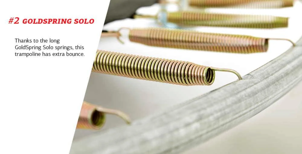 Muelles SoloSpring. Los muelles SoloSpring son muy resistentes al exterior ya que están galvanizados en zinc. Los muelles SoloSpring se sitúan en paralelo entre ellos, de modo que cada punto de tensión de la lona de salto tiene un muelle que tira de él.