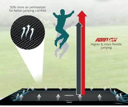 Conseguirás los saltos más altos con la lona de salto AirFlow Pro y los muelles TwinSpring Pro. AirFlow Pro, nuestra lona de salto más nueva, deja pasar no menos del 150% más de aire que una estándar. Los muelles TwinSpring Pro son muelles mucho más grandes, más largos y más gruesos con una constante de muelles mucho más baja, lo que permite a los profesionales saltar aún más alto. Debido a que la colchoneta de salto es más profunda y la cama elástica es menos “”dura””, el Pro Bouncer es la cama elástica definitiva para los saltadores profesionales. Los geniales gráficos en varios tonos del acolchado, la lona de salto, la Safety Net Deluxe XL y la estructura completan esta cama elástica. El Pro Bouncer dura muchos años debido a su excelente calidad. Recibes no menos de 10 años de garantía en la estructura.