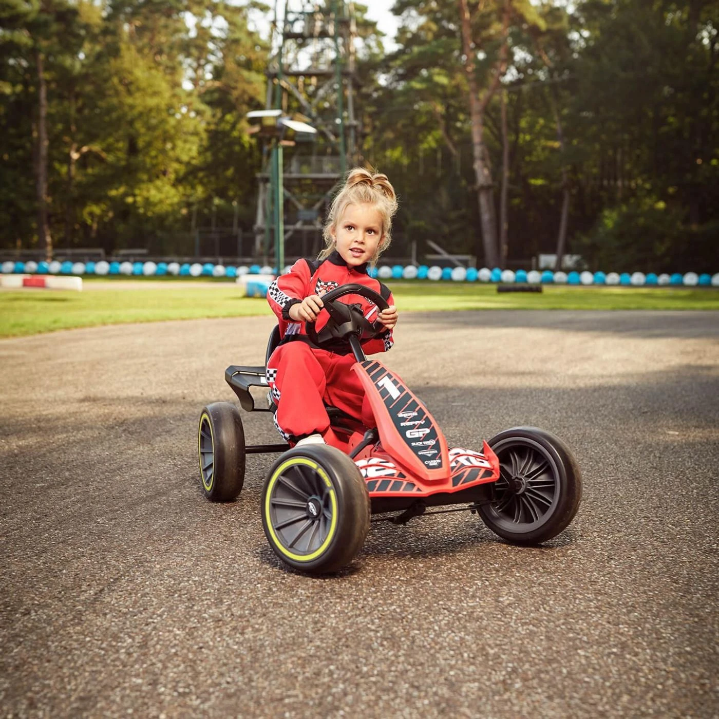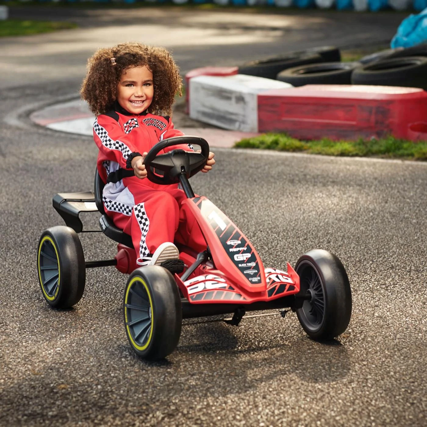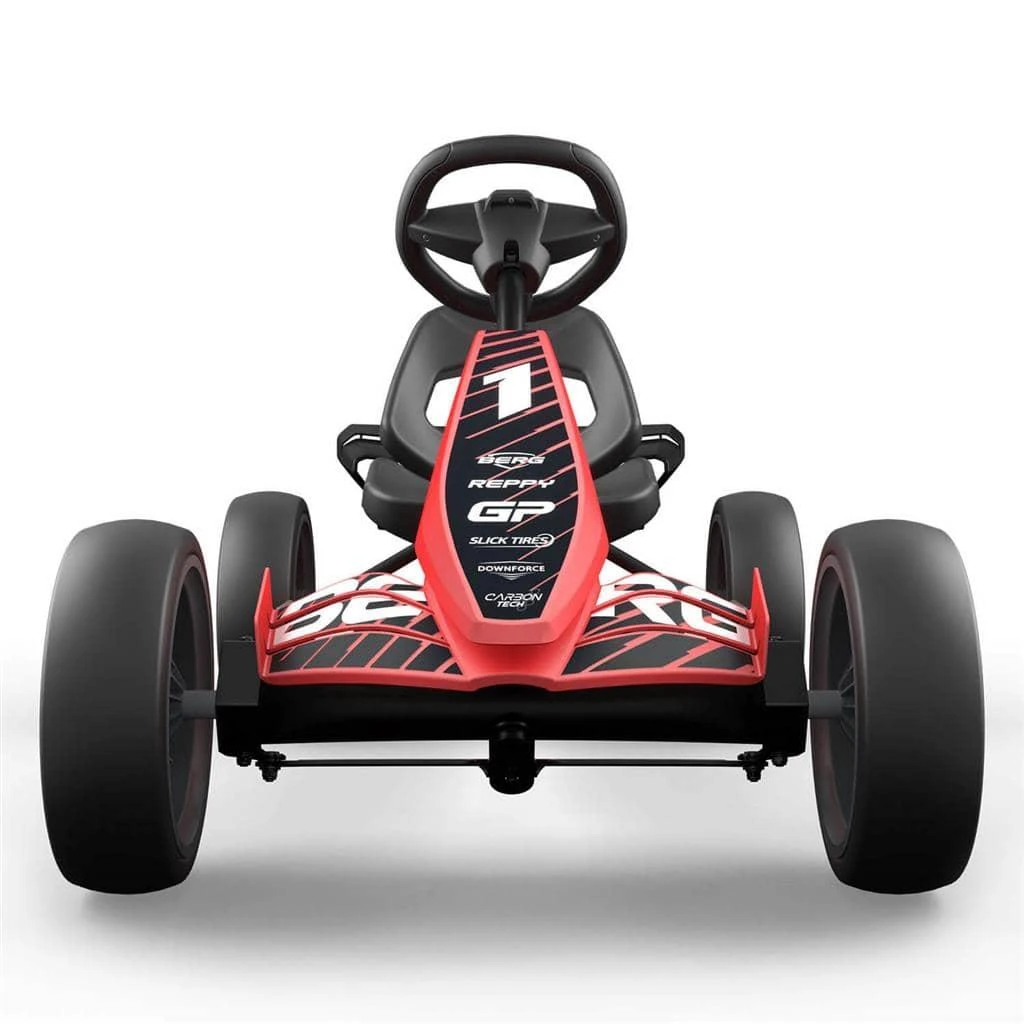 Coche de pedales BERG Reppy GP un coche de carreras rojo para los más rápidos. El coche de pedales BERG Reppy GP viene con volante con sonidos, todos te oirán arrancar el motor, acelerar o frenar. Y si no están atentos, haces sonar el claxon. Esto significa que siempre tendrás la atención de todo el mundo. Correr con el Reppy GP es una experiencia fantástica. El genial diseño molón, el asiento bajo y el volante deportivo son exactamente lo que a ti, como joven conductor, te entusiasmará. El sistema de transmisión directa garantiza una conducción suave y hace que te resulte tan fácil ir hacia delante como hacia atrás.