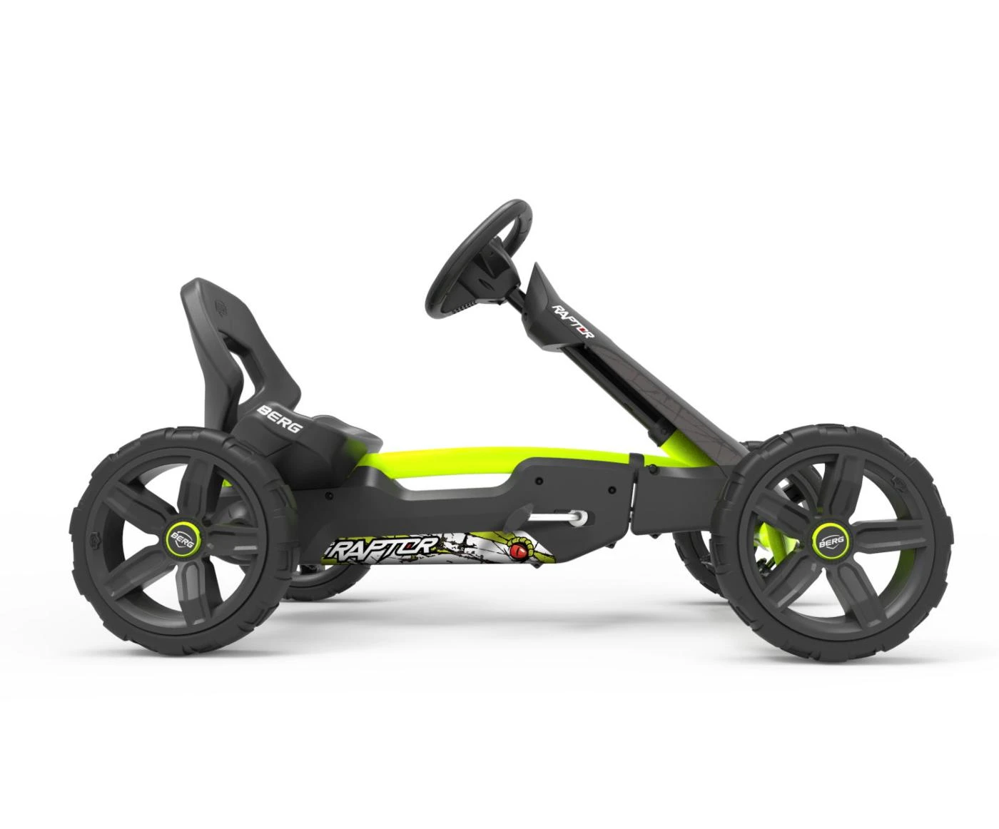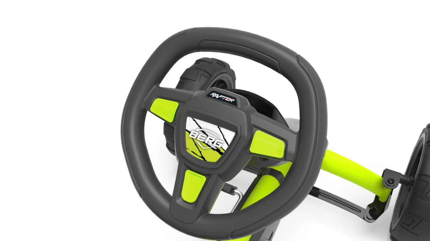 El coche de pedales BERG REPPY RAPTOR es una edición especial de pocas unidades. El cuadriciclo tiene un diseño todo terreno con ruedas de EVA con dibujo para ir por caminos de tierra. El volante deportivo, las ruedas de EVA que nunca se pinchan, el asiento cubo anatómico y el eje de las ruedas oscilante hacen de este kart de pedales muy divertido. Este modelo tiene un volante con caja de sonido de 4 tonos diferentes: frenado, claxon, arranque del motor y aceleración.