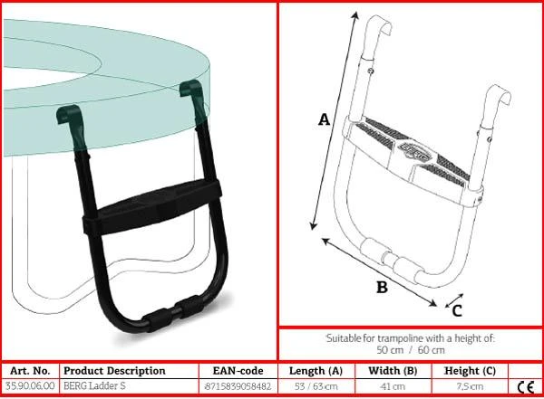 La escalera Berg talla S es compatible para las camas elásticas Berg Talent 183 cm y la Berg Talent 244 cm, es decir, para aquellas camas elásticas que la altura de la estructura del salto haga 50 y 60 cm de alto.