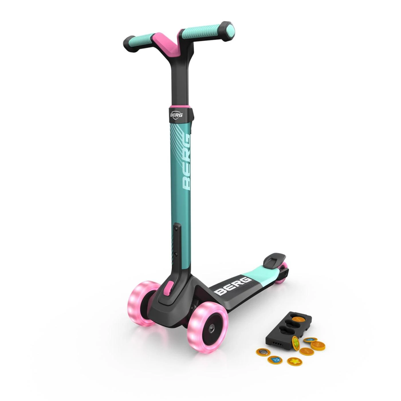 Patinete BERG Nexo Lights plegable con plataforma Magnética, con manillar ajustable, con freno trasero, fácil de conducir, muy seguro gracias a las tres ruedas y manecillas y plataforma antideslizante. Esta versión es con el módulo magnético que viene con 12 monedas para lanzarlas al suelo y al pasar por encima con el patinete quedarán pegadas a la platorma (esta es solamente una de las maneras de jugar con este módulo).